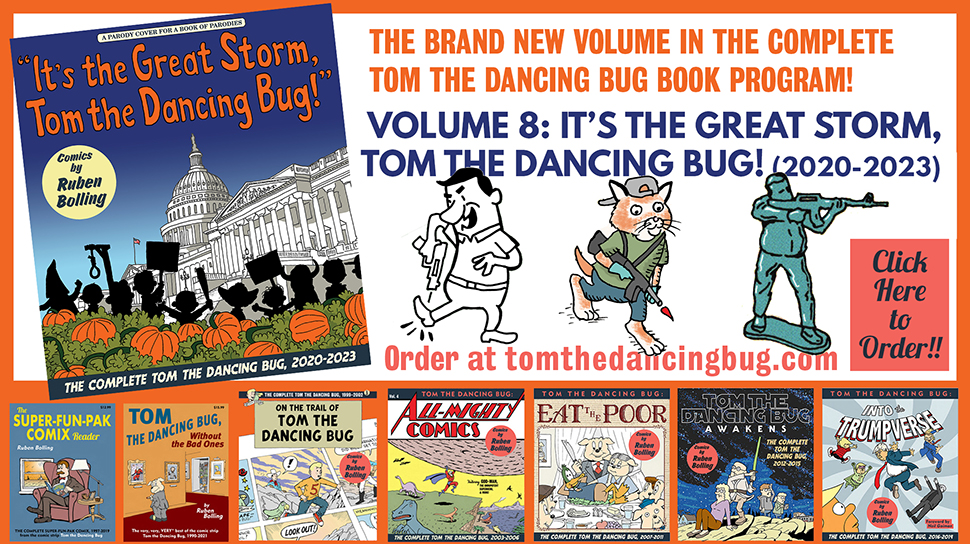 You may purchase the entire 2025 run of Tom the Dancing Bug, top ten and bottom forty, in the form of this handsomely bound pdf, THE 2025 TOM THE DANCING BUG ANNUAL.